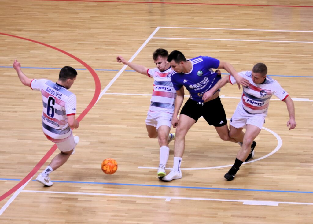 Druga połowa przyniosła jeszcze więcej emocji i trwała dłużej, bo były przerwy związane z urazami i VAR-em. Nie zabrakło też kartek. W 18. min. Patryk Szymecki podwyższył prowadzenie Noe-Trans dobijając piłkę po strzale „Amka” i interwencji bramkarza Pawła Zadrużyńskiego. Drugoligowiec próbował pójść za ciosem, lecz Szpankiewicz i Olszewski nie zdołali zaskoczyć golkipera rywali. W 21. min. zespół z Jeżewa wrócił do gry. Marian Kasperski sfaulował w polu karnym Patryka Klimka. Sędziowie sprawdzili to zdarzenie na VAR-ze i podyktowali karnego, którego wykorzystał Marcin Warcholak. Ten sam zawodnik 60 sekund później powinien doprowadzić do remisu, ale świetnie dwukrotnie interweniował Bernacki. Ta sytuacja zemściła się szybko, bo na 4:2 podwyższył Amadeusz Olszewski. Nerwowo na parkiecie zrobiło się w 23. min. przy rzucie wolnym dla Noe-Trans. W polu karnym Jakub Łytkowski przewrócił będącego bez piłki Martina Gerke. Przysierszczanie domagali się rzutu karnego, ale zamiast tego za protesty żółte kartki ujrzeli Dariusz Gerke i Marek Bernacki. Dla tego drugiego była to już druga i musiał opuścić boisko, a zastąpił do Dawid Szpankiewicz jako “lotny bramkarz”. KP/APIS wykorzystał grę w przewadze, bo Marcin Warcholak najpierw wywalczył rzut karny, a potem zamienił go na kontaktową bramkę. Jednak nadzieje na doprowadzenie choćby do dogrywki szybko upadły, bo w ciągu niespełna minuty mistrz II ligi zadał dwa decydujące ciosy. W 25. min. rzut karny przedłużony wykorzystał Dawid Szpankiewicz, a 45 sekund później, po dobrze rozegranym rzucie rożnym, na 6:3 trafił Amadeusz Olszewski. „Amek” w ostatniej minucie ustalił końcowy wynik.